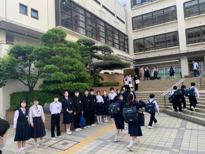 ピッカピカに晴れあがった4月最後の登校日です。生徒会と風紀委員に加えて、美術部があいさつ運動をしてくれました。