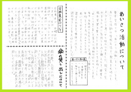 表面では、生徒会執行委員と活動の紹介、各常置委員会からの報告。裏面では「あいさつ運動」「全校集会」「傘の貸し出し」についての記事が掲載されています。
