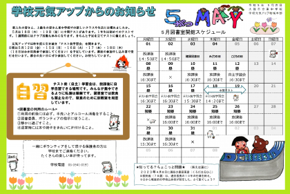 元気アップでは昨年度に引き続き「テスト前学習会」を開きます。日程は5月12日(金)・15日(月)・16日(火)・17(水)・18日(木)(18日はお弁用持参で参加してください)を予定しています。参加申し込み書で受付を行います。都合の良い日にぜひ参加してください。お待ちしています。