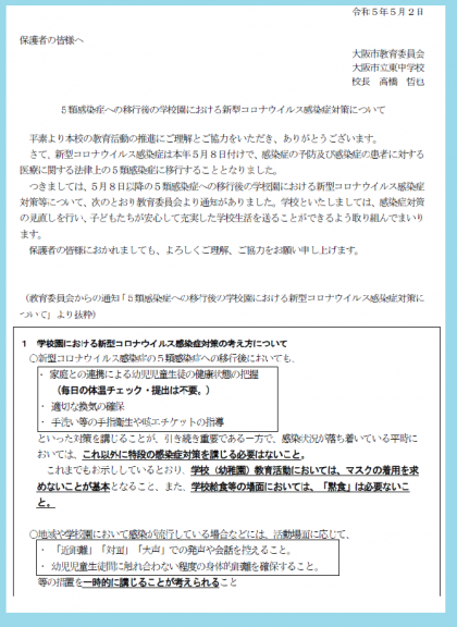 つきましては、5月8日以降の5類感染症への移行後の学校園における新型コロナウイルス感染症対策等について、次のとおり教育委員会より通知がありました。学校といたしましては、感染症対策の見直しを行い、子どもたちが安心して充実した学校生活を送ることができるよう取り組んでまいります。
