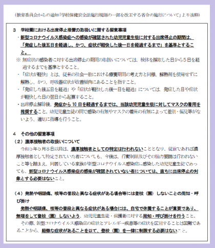 ・出席停止解除後、発症から10日を経過するまでは、当該生徒に対してマスクの着用を推奨します。