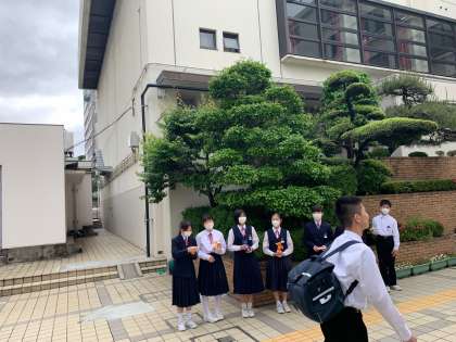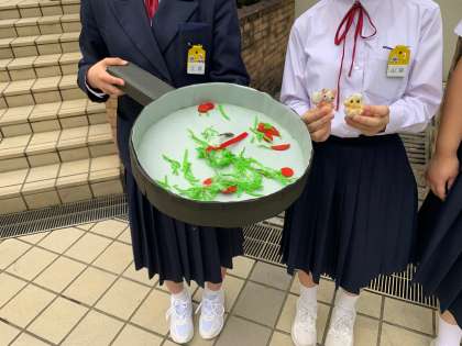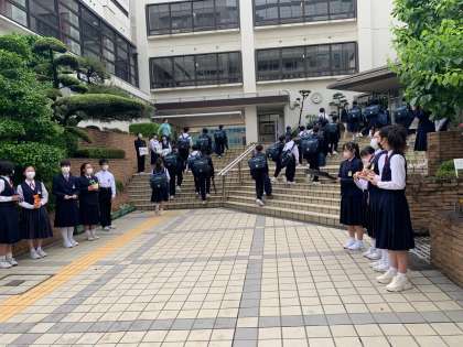 今朝は、生徒会や風紀委員に加えて、家庭科部が「あいさつ運動」をしてくれました。