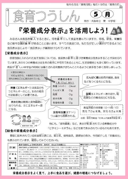食育つうしんでは、「『栄養成分表示』を活用しよう!」の見出しで、配布されている給食献立表の見方などに関する記事が掲載されています。