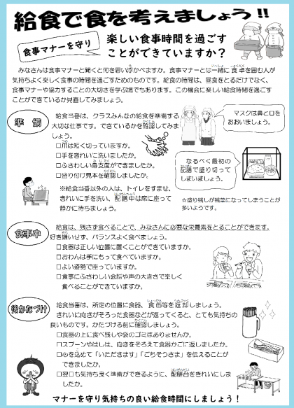裏面の、「給食で食を考えましょう!!」では、「マナーを守り気持ちの良い給食時間にしましょう!」との記事が掲載されています。なお、本校では、給食当番による配膳をバイキング方式で受け取るスタイルで行っていますので、衛生面からすべての生徒の皆さんに、マスクの着用をお願いしています。ご理解とご協力をお願いします。