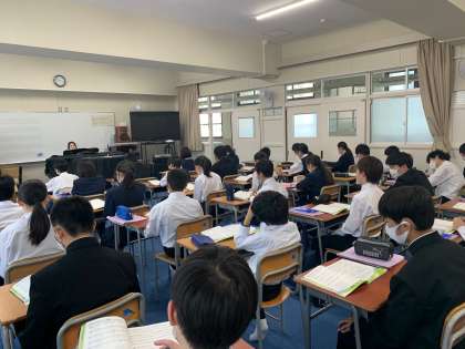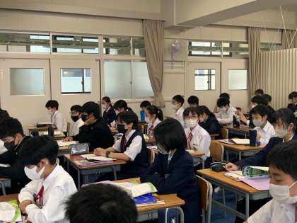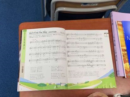 教科書から、「杉本竜一作詞、作曲『We'll find the way〜はるかな道へ』」を合唱し、曲の雰囲気にあった歌声や、「テクスチュア」について学びます。