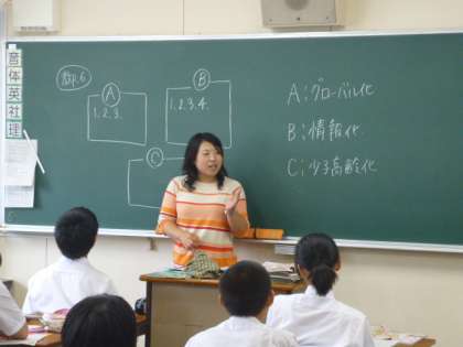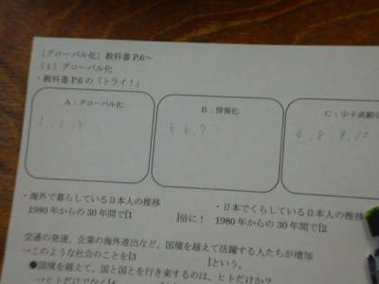 今日の4時間目、社会科の西奥先生の授業は、スーパーマーケットの様子を写した写真を、グローバル化・情報化・少子高齢化という現代社会の様子を表す3つのグループに分類するというものでした。