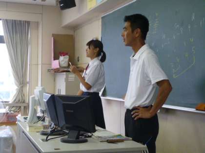 前に出て出題する生徒の声をじっくり聞いた後、その答えをグループで相談します。