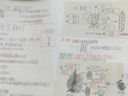 花のつくりについて学びます。種子植物には、被子植物と裸子植物からなり、共通点などを考え発表していました。ノートもきれいにとれていました。