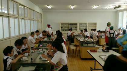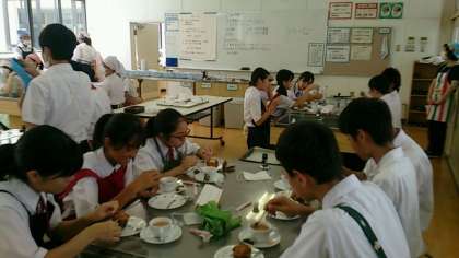 家庭科では、調理実習に取り組んでいます!班で協力しながら、カップケーキと紅茶づくりです。