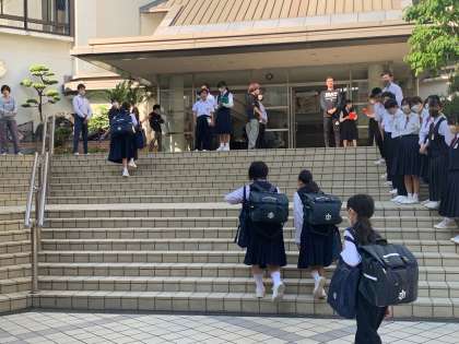すこし登校が遅くなった生徒に「早くこよう!」と声かけをしてくれています。生徒同士のあたたかい会話でした。