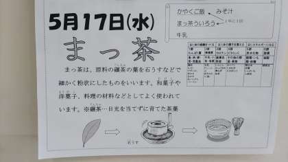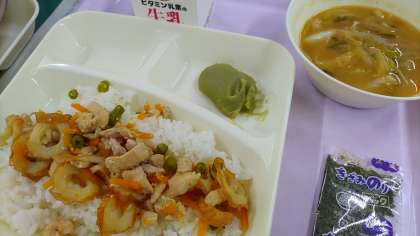 今日の給食は、かやくご飯、みそ汁、まっ茶ういろう、牛乳です。