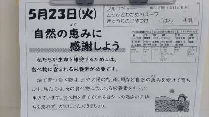 給食では、和食、洋食、中華料理以外にも様々な国の料理が出てきます。今回は韓国料理の一つでした。次はどこの国の料理と出会えるでしょうか。楽しみに待っていてください。