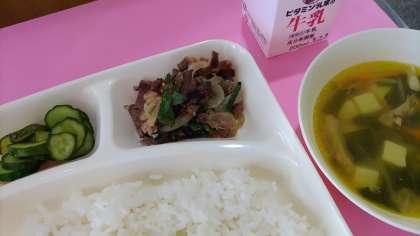 今日の給食は、プルコギ、とうふとわかめのスープ、きゅうりの甘酢づけ、ごはん、牛乳です。