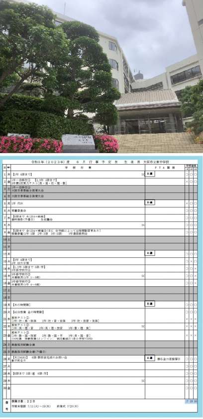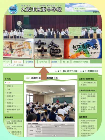 1年生は一泊移住、2年生は校外学習、3年生は修学旅行があります。その後、期末テストを挟み、「創立記念日」があります。本校は昭和63年4月に旧東中学校と船場中学校の統合により、新しく大阪市立東中学校として発足しました。そして、平成元年に現在の大手前に完成した校舎での教育活動が始まりました。35年の区切りの創立記念日です。この日に「新校舎をお祝いする会〜創立35周年〜」を行います。