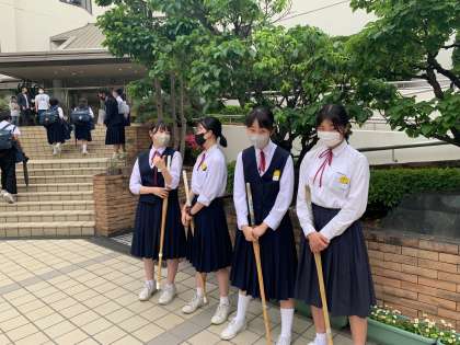 今週はずっと雨予報の月曜日。生徒会、風紀委員とともに、剣道部があいさつ運動をしてくれました。竹刀を手に礼儀よく〔おはようございます!〕とあいさつしてくれました。