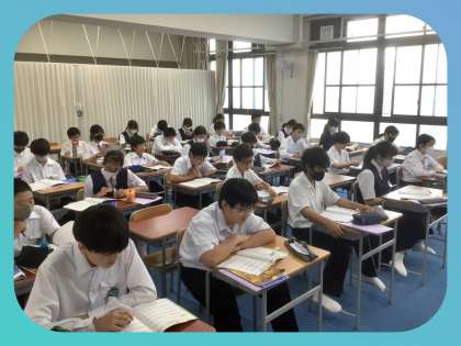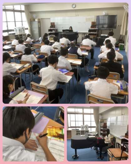 1年生の音楽科の授業です。変声期のために、声が出にくいと感じている生徒もいるようですが、先生のピアノにあわせて、しっかり楽譜を見て歌っています。