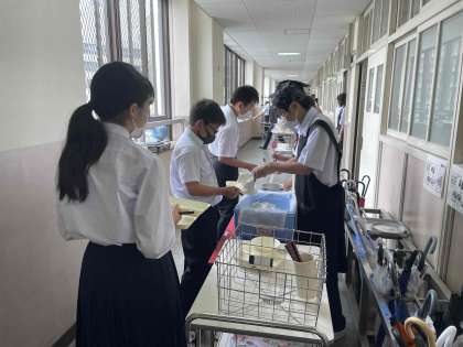 給食当番に当たっている生徒が、自ら積極的に配膳を行っています。