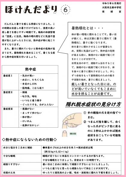 今月号では、「熱中症」に関する記事が掲載されています。「暑熱順化」「熱中症の症状」「熱中症にならないための行動」など大切な内容です。