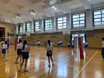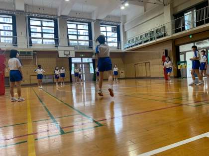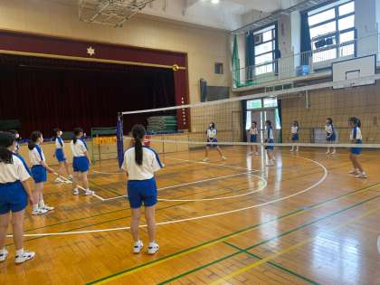 体育館でバレーボールの学習をしています。