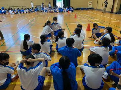 ビルディングゲームの練習が思わず盛り上がり、みんな汗だくです。