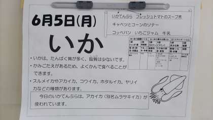 今日の給食は、いかてんぷら、フレッシュトマトのスープ煮、キャベツとコーンのソテー、コッペパン、いちごジャム、牛乳です。