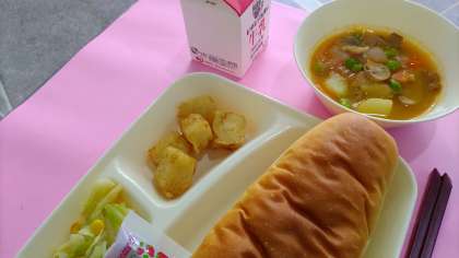 今日のスープは、フレッシュトマトが入っていたことに気が付きましたか?缶詰ではなく、配送されてきたトマトをそのままつぶしてスープ煮に使われていました。適度な酸味とトマトの風味がとても食欲をそそりました。おいしかったですね。