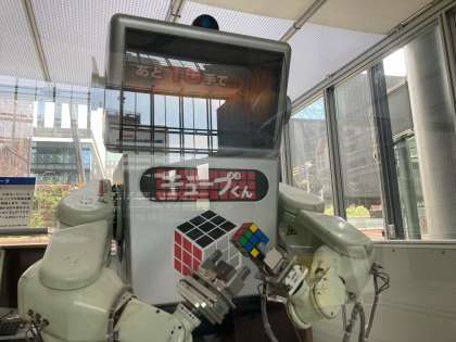 「どんなにバラバラになっていても、キューブくんに解けないルービックキューブはありません。その秘密は、コンピュータの頭脳と、産業用ロボットアームでできていて器用に動く両腕にあります。」