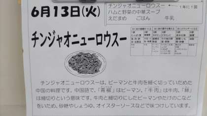 今日のメニュー、チンジャオニューロウスー、とても人気が出そうです。今頃皆さんもおいしそうなにおいにひかれながらも授業や集会で頑張ってくれていることでしょう。