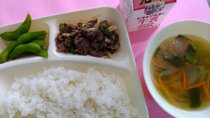 今日の給食は、チンジャオニューロウスー、ハムと野菜の中華スープ、えだまめ、ごはん、牛乳です。