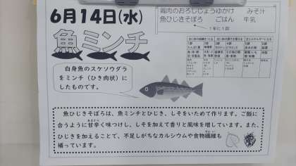 魚ひじきそぼろ、とても分かりやすい名前の料理ですね。ただ、事前の情報なく食べたこともあり、今日は食べ終わるまで「メインは鶏肉で、ご飯の上にも鳥そぼろ?」と思っていました。食べてみたとき、いつもと食感が違って柔らかいな、と思っていたのですが、そもそも材料が鶏肉ではなく、魚だったと知って、合点がいきました。