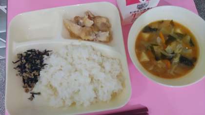 今日の給食は、鶏肉のおろしじょうゆかけ、みそ汁、魚ひじきそぼろ、ごはん、牛乳です。