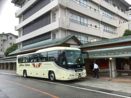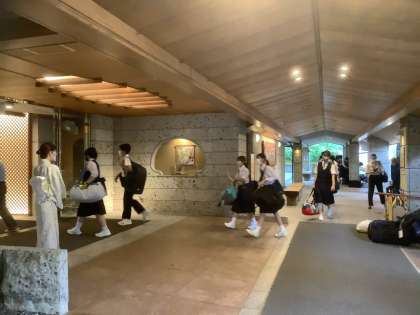 予定通りにバスが到着しました。宿舎の方のお出迎えをいただき、手際よく入館しています。