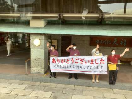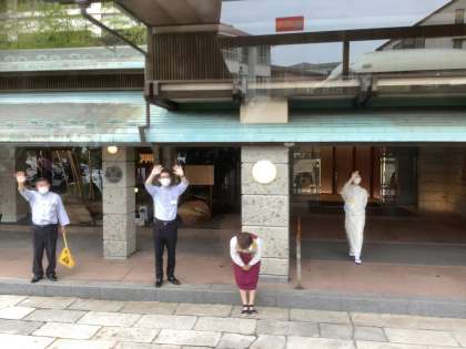 宿舎の皆さまに、お見送りいただき、バスは金沢城公園へ向かいます。