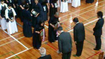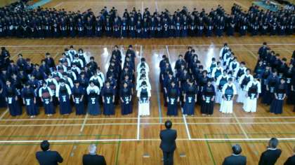 剣道の会場となっている住吉スポーツセンターでは、総合開会式が行われました。主催者を代表して、山本教育長のご挨拶、中学校体育連盟の泉会長から激励のお言葉がありました。厳粛な雰囲気の中、式が進みました。そんな中、昨年度、準優勝の東中女子代表から準優勝盾を返還しました。