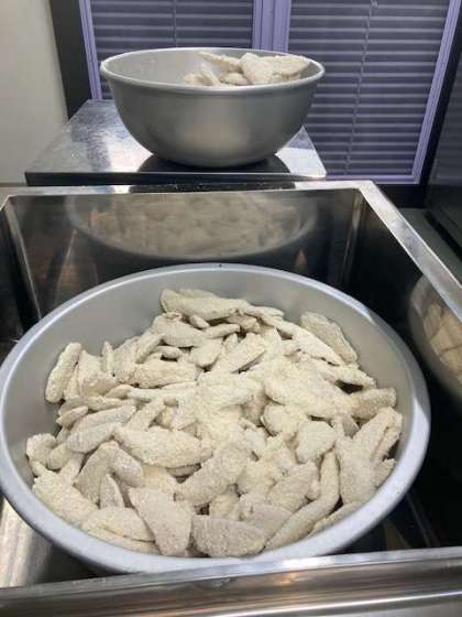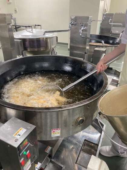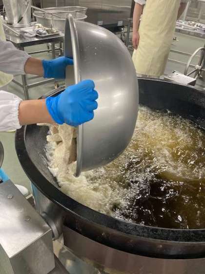 今日の給食の一つ「サーモンフライ」を給食室で作る様子です。