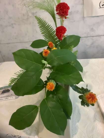 玄関のお花を生け替えていただきました。いつも東中生のために、ありがとうございます。お花のお題は「向暑への覚悟」。「鶏頭・紅花・スモークグラス・レモンリーフ・玉シダ」が、花器を縦長に使って生けられています。
