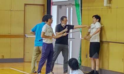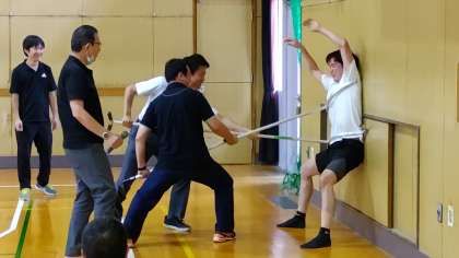 その方から「さすまたは相手を制するものというより、威嚇して外に追い払うもの」と教えていただくとともに、「実際に使ってみて、効果があるのか、ないのか試してみましょう」と実際の使い方も教わりました。