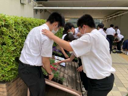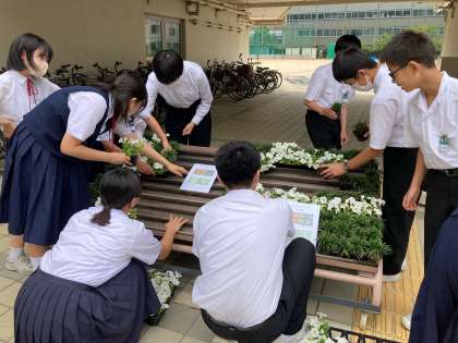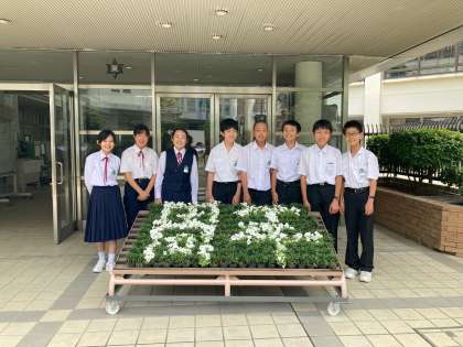 月曜に行われる式典のため、管理作業員さんと一緒に花文字を準備しました。「3マス緑で、1マス白!」「3段目左から!」と、声をかけ合いながら頑張りました。