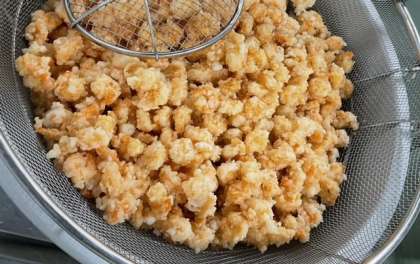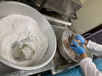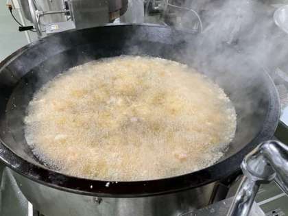 手作業でえびに衣をつけて、油で揚げていきます。最後にソースとからめて完成です。出来立て、アツアツのえびのチリソースをしっかりと食べてくださいね。