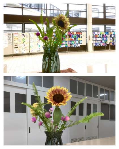 玄関ホールと職員室前のお花を生け替えていただきました。玄関ホールには「ひまわり・千日こう・たましだ」、職員室前には「キキョウ・千日こう」です。いつも東中生のためにありがとうございます。