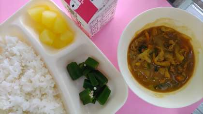 今日の給食は、和風カレー丼、オクラのかつお梅風味、りんご(缶詰)、牛乳です。