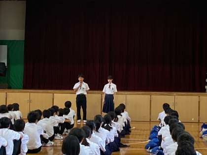 「私たちはどうして戦争について学ぶのでしょう?先週は沖縄戦について、新聞を用いて学習しましたね。自分の優しい兄弟や父が、ある日突然、他の国で誰かを傷つけなければならない立場になる。これが、戦時中に本当にあったことです。戦争を学ぶことで、平和を知ることができます。自分の心が平和でなければ、本当の平和について考えられません。平和な友だち関係、平和なクラス、平和な学年、平和な学校、そして平和な地域、日本、世界へと、平和の輪は広がっていきます。しっかり学んできてください。」