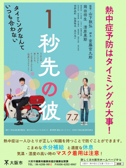 大阪市より、熱中症予防の映画とのタイアップポスターが届きました。早め早めの水分補給と休憩を心がけ、熱中症予防に努めましょう!!