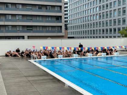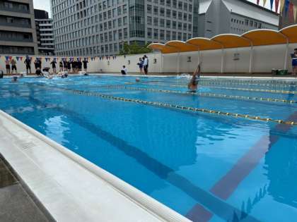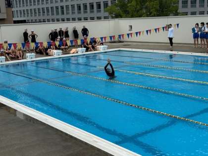続いて、先生がプールに入り、実際に泳いで見本を見せ、指導されていました。そして、生徒の皆さんも真剣に見て、実際に練習していました。