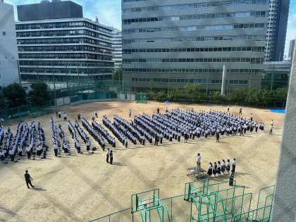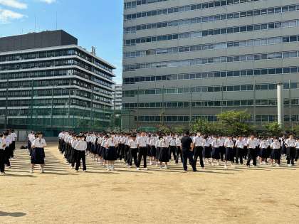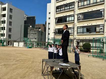久しぶりに、リモートではなく、対面での全校集会を行いました。700人を超える生徒が運動場に集まるだけでも大変ですが、学級代表が指示を出し、素早く集合できました。