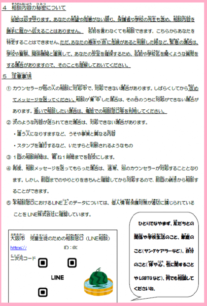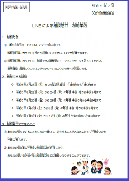 大阪市立の学校に通う生徒のみなさんが利用できる相談窓口について、お知らせします。電子メールや FAX、電話による相談窓口は、「相談窓口についてのお知らせ」のとおりです。また、LINEでも相談を受け付けています。「LINE による相談窓口 利用案内」をご覧ください。もし、いじめや友だち関係、学校生活、家庭生活などについて悩みがあるときは、あなたにとって一番相談しやすい方法で相談してください。