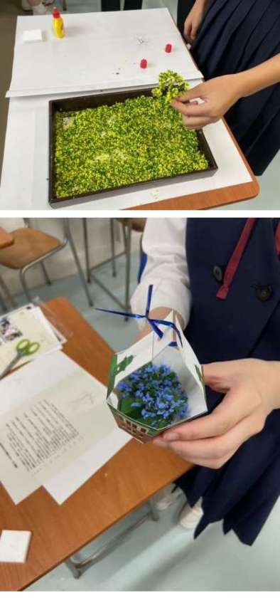 先生方からご指導いただき、建築模型に使う樹木のミニチュアを作成します。針金で樹木本体を形造り、葉や花を模したスポンジをつけて完成です。