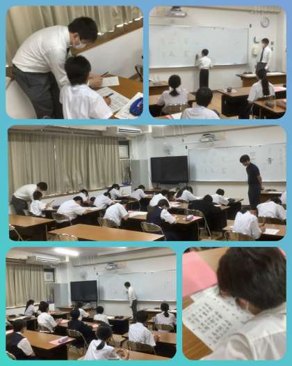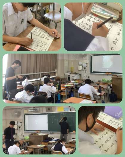 1年生の国語(書写)では、筆ペンを使っての授業を少人数分割授業で行っています。3人の先生が2つの教室の授業を展開し、一人の先生は、前半と後半で、教室を移動して指導に当たっています。また、お手本の生徒の手元をタブレットで映して、スクリーンに投影し、生徒の見本になるような工夫も施されています。