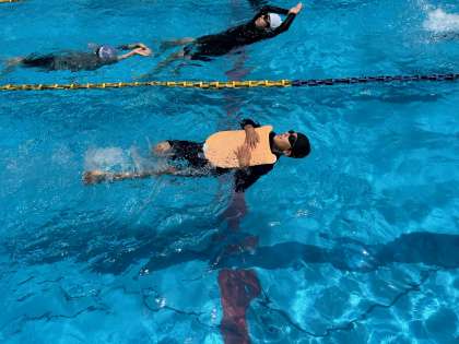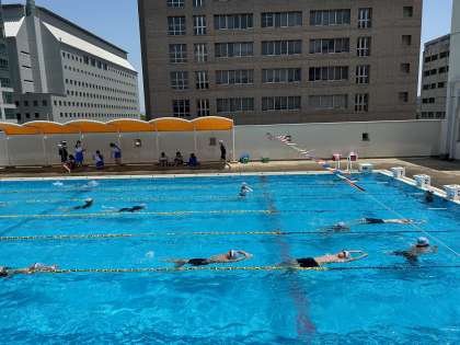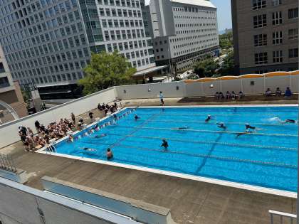 暑い中、とても気持ちよさそうに水泳の授業をしています。今は、背泳ぎにチャレンジしていました。なかなか、ぷーっと浮くのはむずかしいようです。がんばってくださいね!!