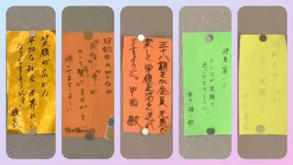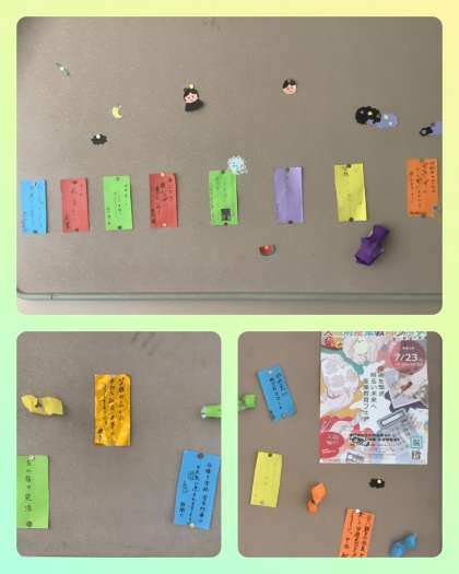 七夕に合わせて、先生方が願い事を短冊に書き、5階の掲示板に掲示されています。大きな願いから、小さな願い、思わず微笑んでしまうような願い等など、1年生の文化委員の生徒の皆さんが企画・飾り付けをしてくれました。「元気」「楽しく」「笑顔」「健康」「平和」など、生徒たちを慮る願い事が目に留まります。